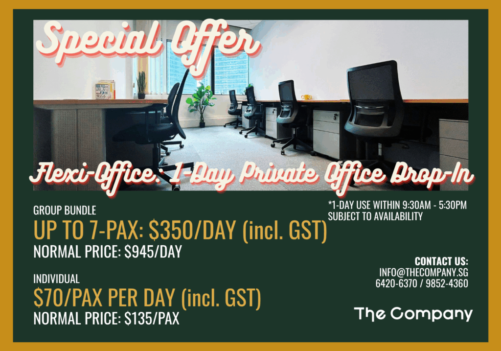 Work in a more private, quiet space in Singapore CBD at a low cost with our flexi 1-day drop-in private office deals!